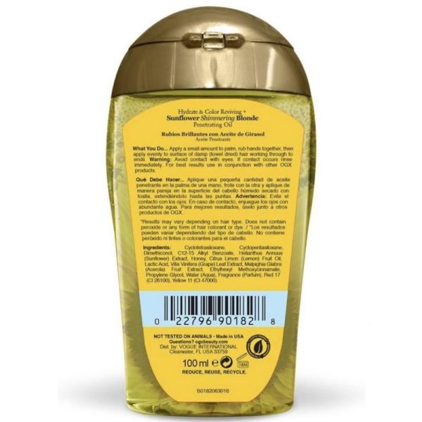 روغن آفتاب گردان OGX از درصد بالایی روغن آفتابگردان تهیه شده است که در ترمیم ساقه مو بسیار موثر است،ساقه مو را تغذیه کرده و استحکام میبخشد،این محصول از موهای شما در برابر نور محافظت میکند.
