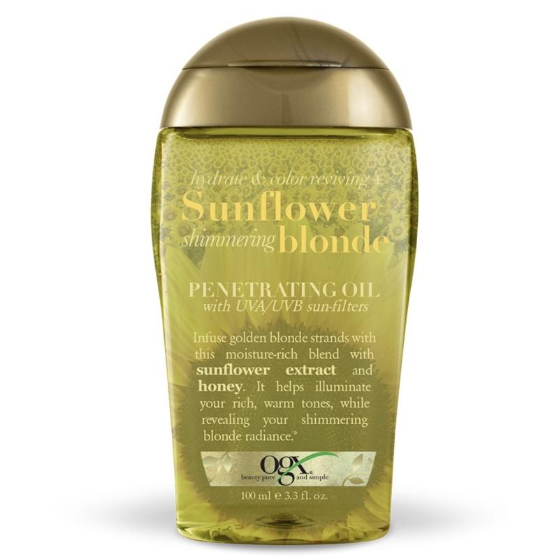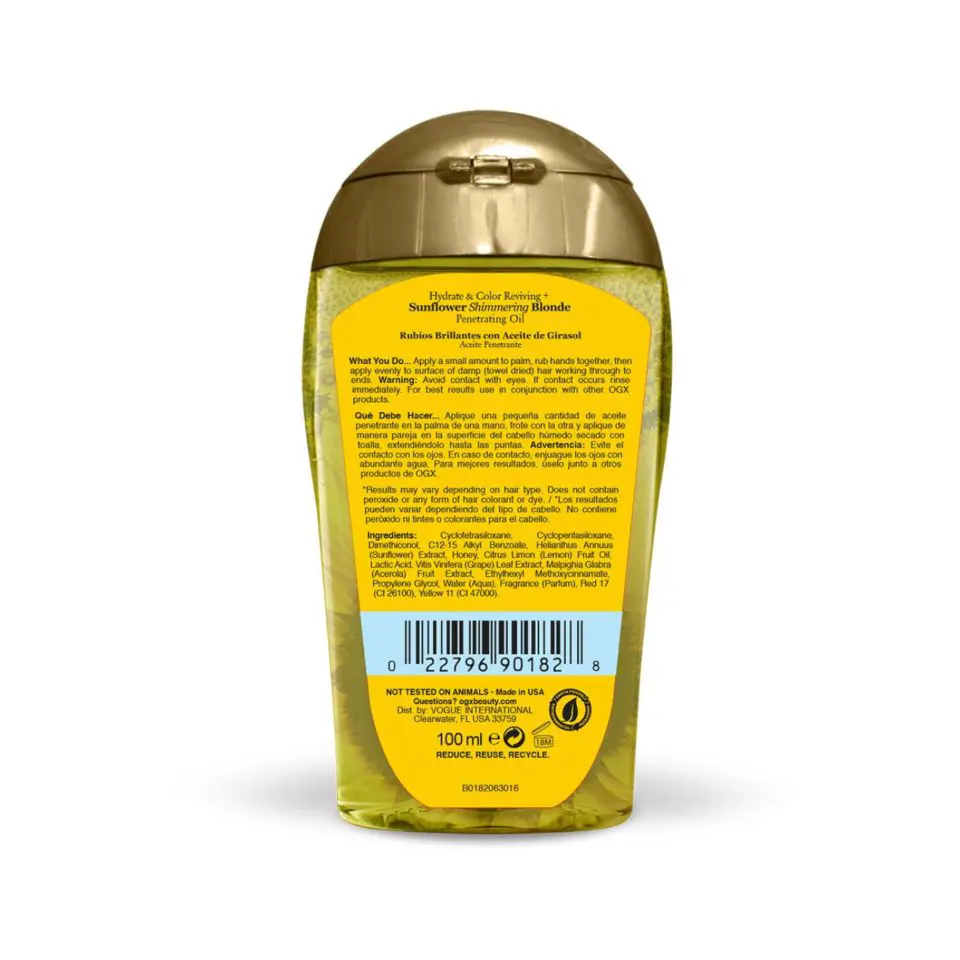 روغن آفتاب گردان OGX از درصد بالایی روغن آفتابگردان تهیه شده است که در ترمیم ساقه مو بسیار موثر است،ساقه مو را تغذیه کرده و استحکام میبخشد،این محصول از موهای شما در برابر نور محافظت میکند.